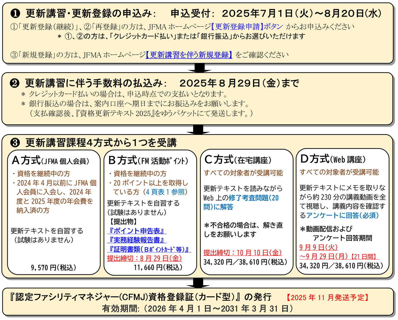 認定ファシリティマネジャー(CFMJ)資格制度では、資格登録の有効期間を5年と定めています。資格登録の更新は、【有効期限の前年】に更新講習の課程を修了すること で完了します。